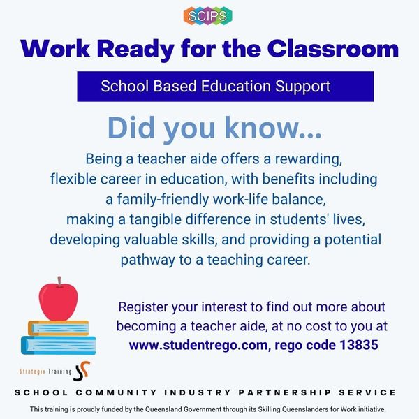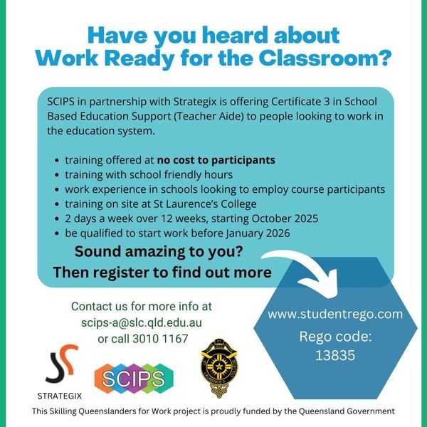 SCIPS is offering a Certificate III in School Based Education Support to enable participants to commence employment in the education field. Hosted at St Laurence’s College, we are keen to connect with people looking to make a career change, re-enter the workforce or commence work. This is a great program being offered to 15 participants – so you need to be quick and register your interest in the program.