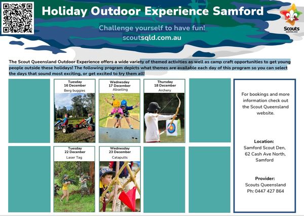 Scouts Queensland is again running their Holiday Outdoor Experience at Samford during December and January - see below the Scouts QLD website for more information: