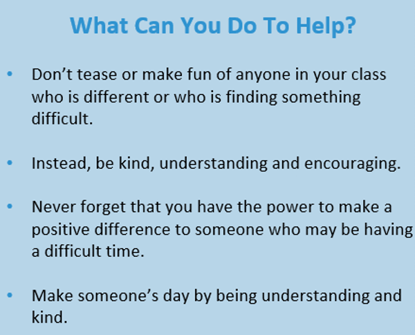 Students will be reminded why it is important to understand that our brains are unique and as such, how each of us view, experience, interact and contribute to our world and community will be different. A key message will be what we can do to support and encourage neurodiverse students in our classrooms and Lauries community.