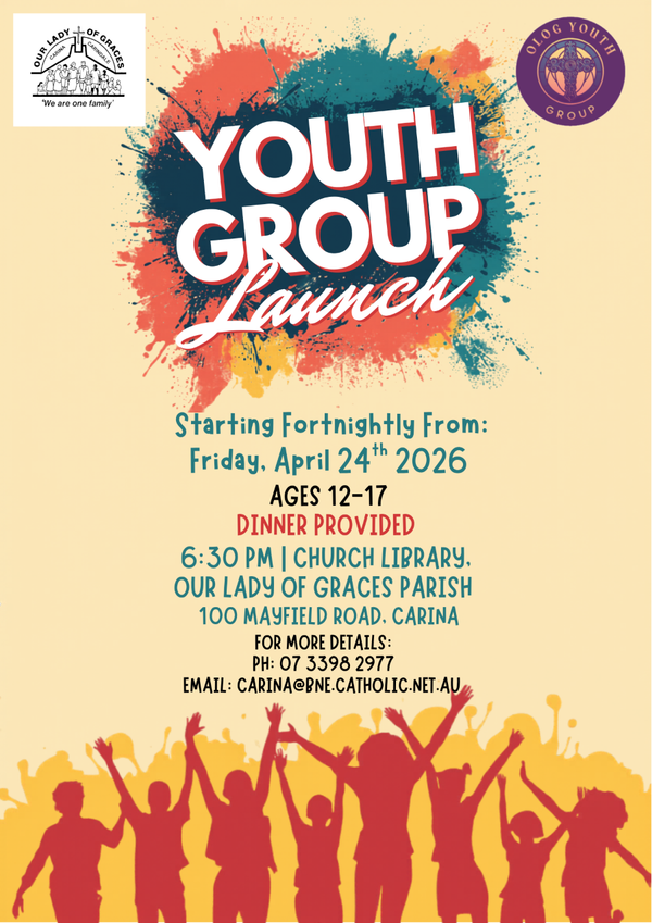 Please see below for information for the new High School Aged Youth Group launching at Our Lady of Graces Parish, Carina. The group will begin in Term 2 from 24 April at 6.30pm.