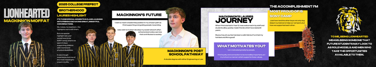Mackinnon valued the community of Lauries and events like Sony Camp made a major impact on him. Mackinnon has his heart set on studying a Double Degree with either Engineering or Law.