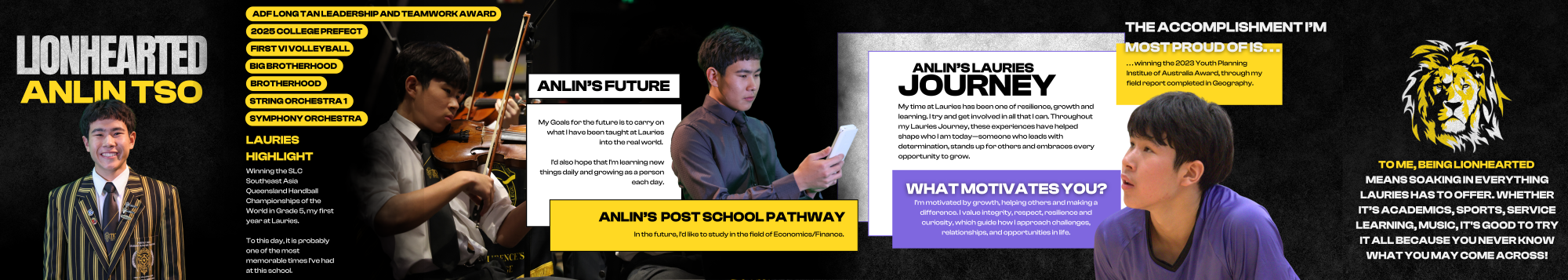 In 2025 alone, Anlin led the College as a Solidarity and Culture Prefect, represented the First VI Volleyball as well as a number of orchestras and choirs, including String Orchestra 1 and Brotherhood and received the ADF Long Tan Leadership and Teamwork Award at the Secondary School Awards.