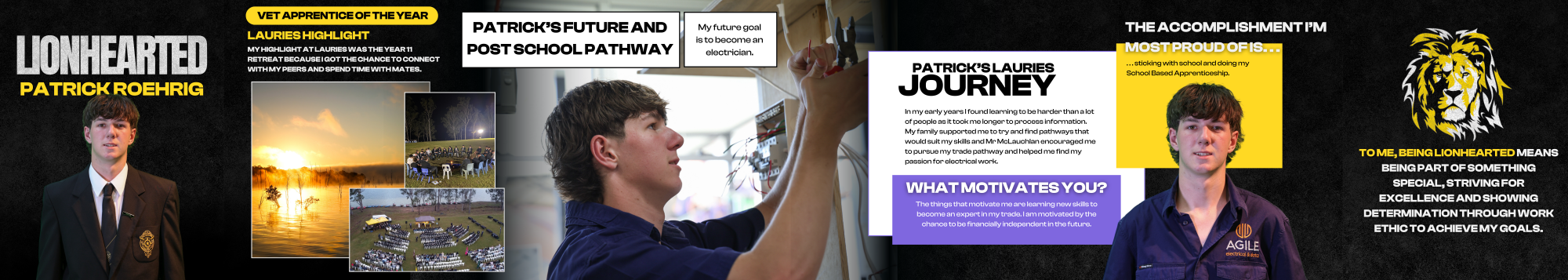 Through the assistance of Mr James McLauchlan, key staff and his family, Patrick has gone on to achieve great things in his electrical apprenticeship.